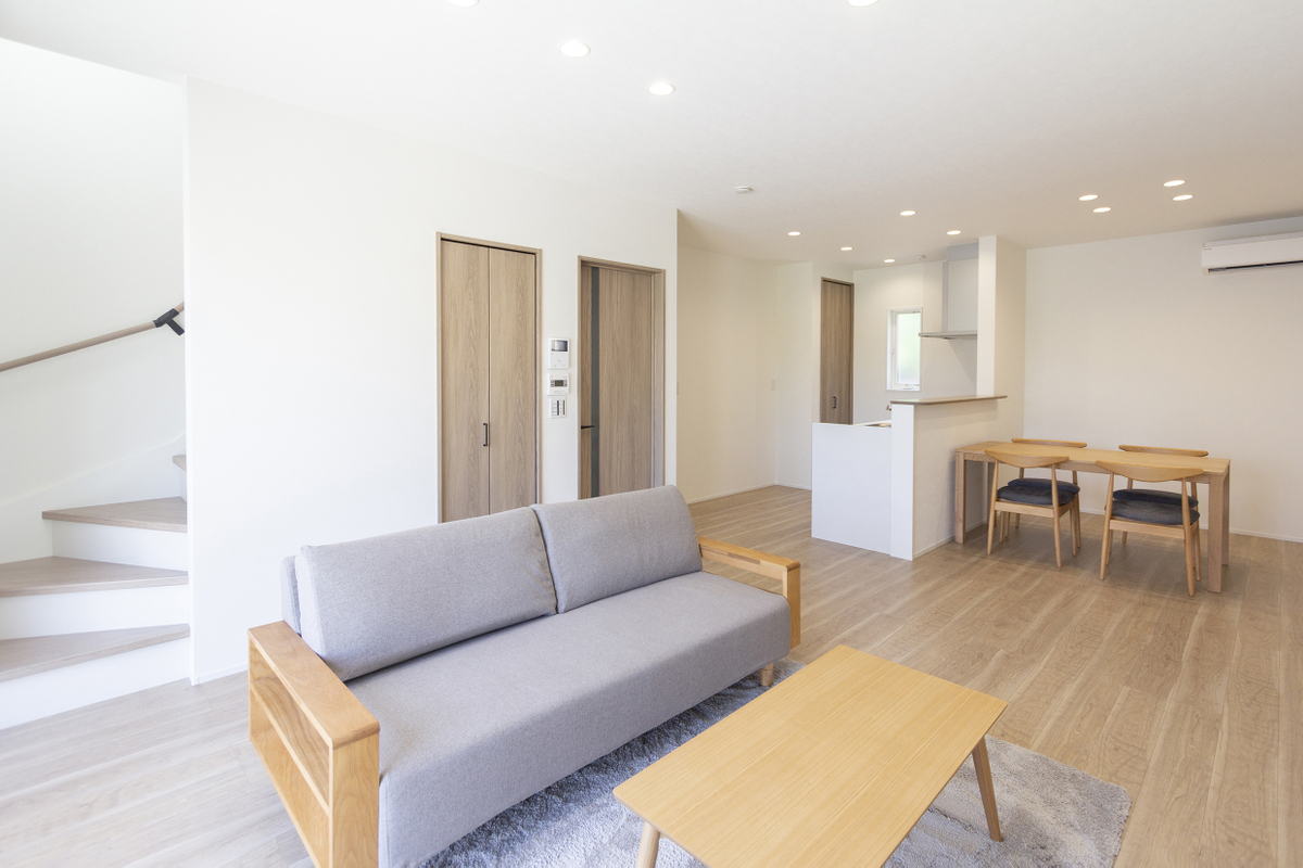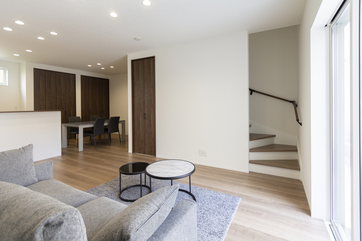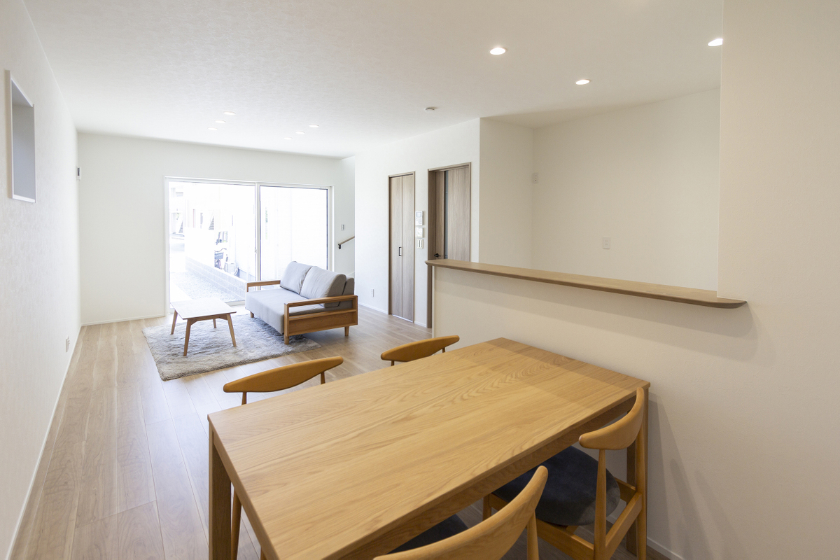 南向きLDKは約19.3帖。対面キッチンからリビングやダイニングに視界が開け、お子様がのびのびと遊べるゆとりもある広さです。1階と2階を緩やかにつなぐリビング階段により、ご家族同士の会話も自然と増え、絆が深まります。