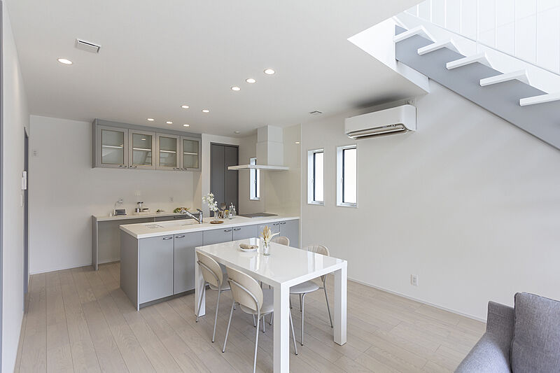 ・約18帖LDKはフラット対面キッチンやオープン階段、吹抜で開放的!