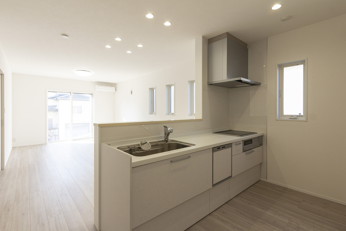 ・LDKが南窓に面し、対面キッチンから洗面所がすぐ。