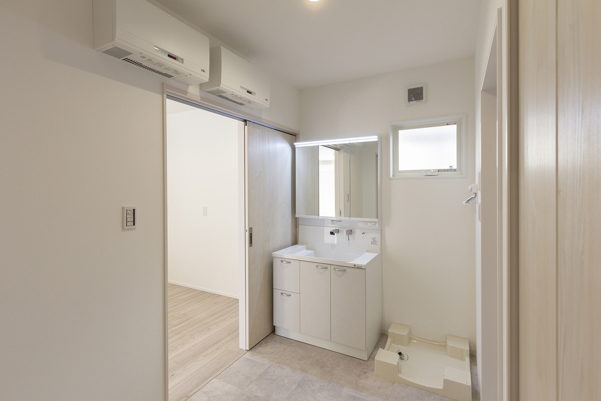 玄関~キッチンへの動線上に水回りを配置。帰宅時にすぐ手洗いがで...