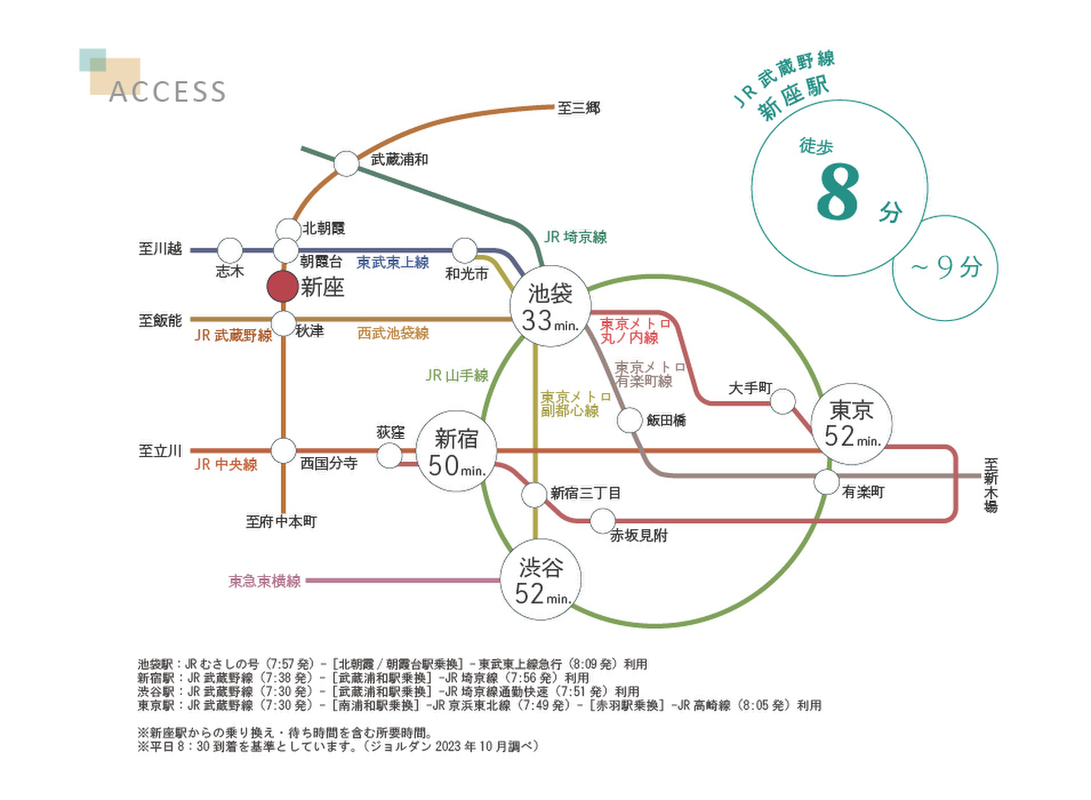 - JR武蔵野線「新座」駅 徒歩8分~9分東武東上線「志木」駅 バス10分「新座駅南口」停 徒歩10分~11分東武東上線「朝霞台」駅 バス15分「新座団地入口」停 徒歩15分~16分