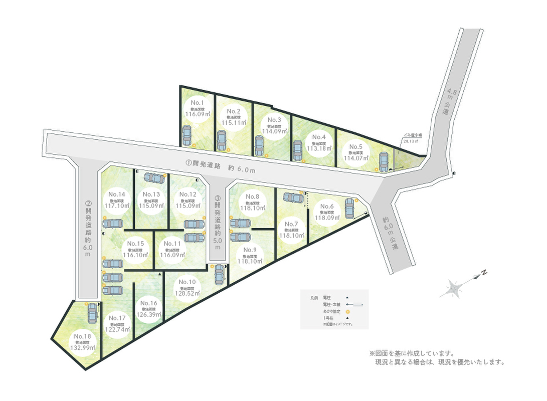 | 駐車場 | 1台 ~ 2台 | 道路の幅員 | 北川約4.8m~6.0m公道、開発道路5.0m~6.0m |