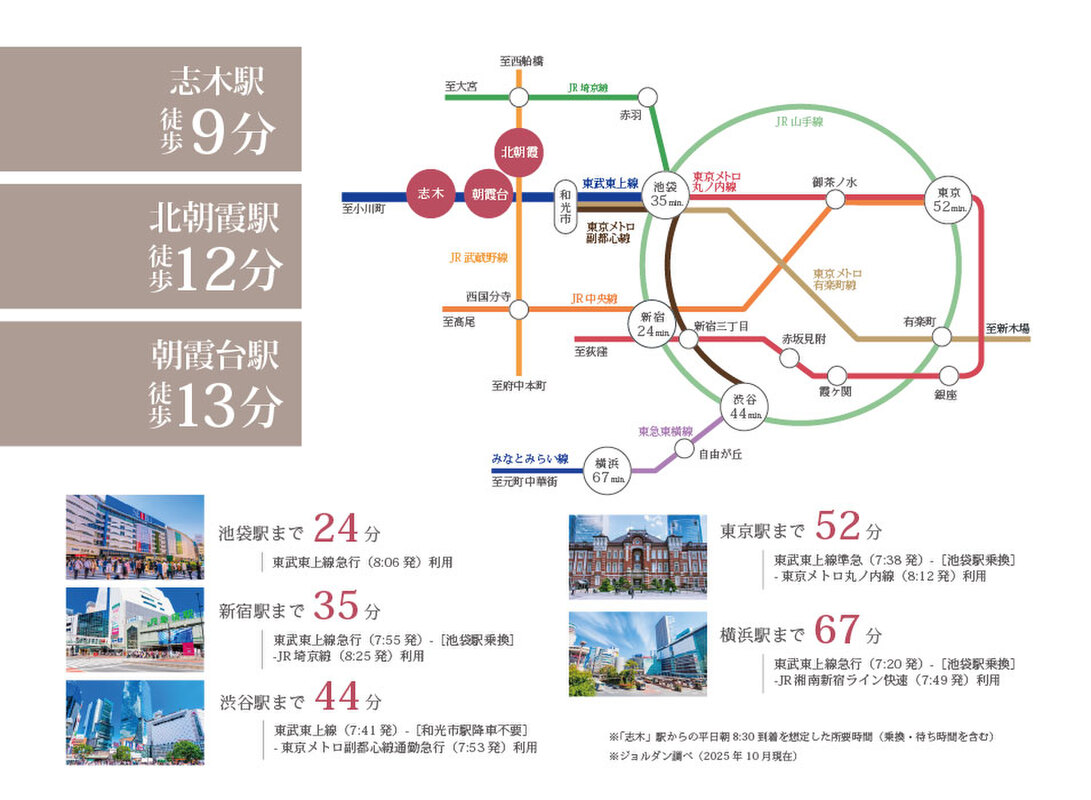 東武東上線「志木」駅 徒歩9分 JR武蔵野線「北朝霞」駅 徒歩12分 東武東上線「朝霞台」駅 徒歩13分 |