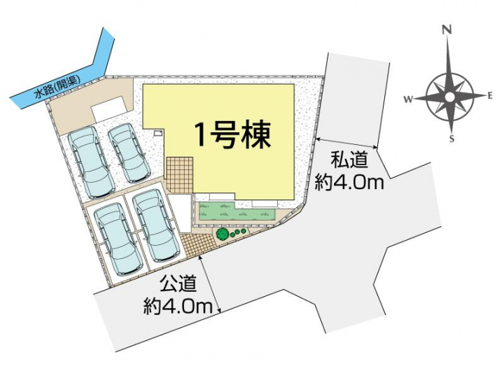 | 駐車場 | 4台 | 道路の幅員 | 東4.0m私道、南東4.0m私道 |
