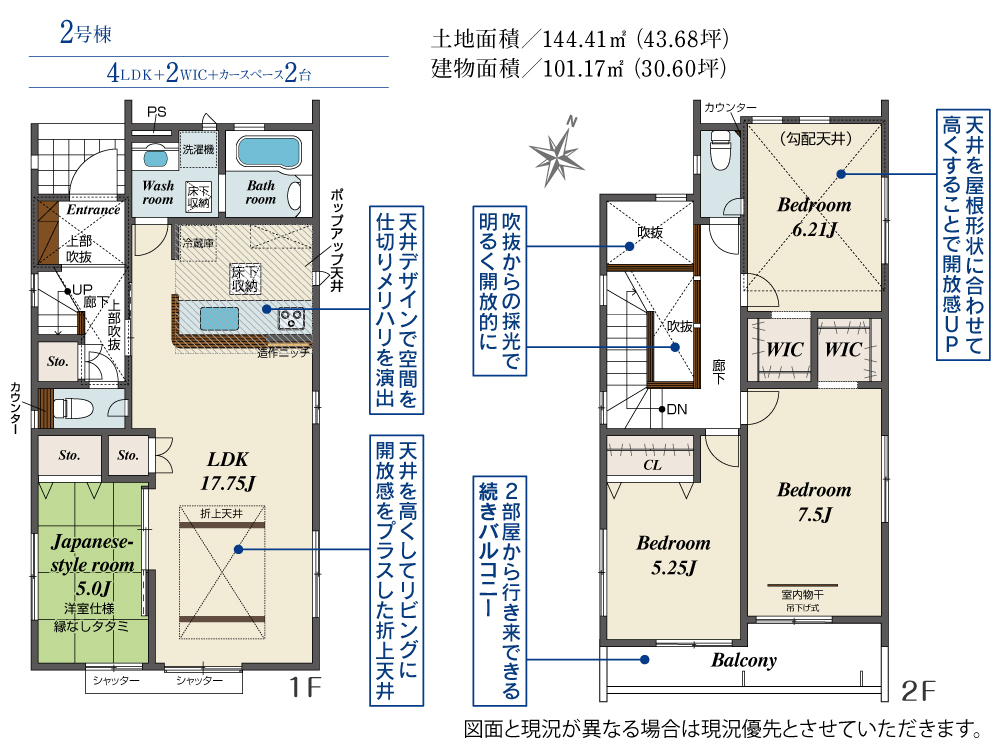 | 建物面積 | 100.54m2(約30.41坪)~101.17m2(約30.60坪) | 土地面積 | 144.41m2(約43.68坪) |