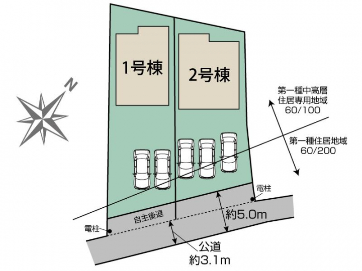 【接道】南東4.0m公道 【設備】公営水道、東京電力、個別プロパンガス、本下水 【自主後退】(1)号棟16.42m2、(2)号棟19.59m2、地役権設定有り |