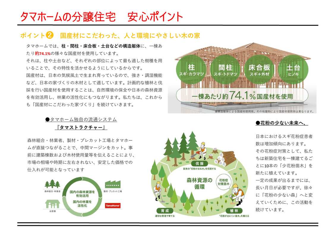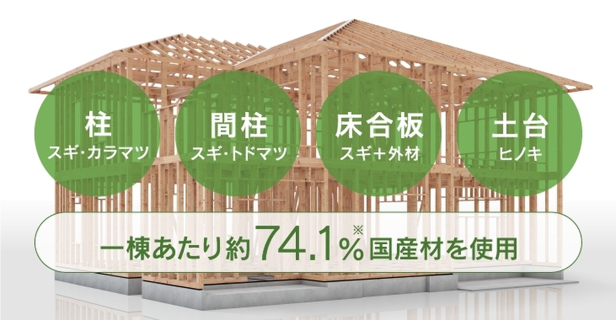 タマホームでは、柱・間柱・床合板・土台などの構造躯体に、一棟あたり約『74.1%』の様々な国産材を使用しています。
