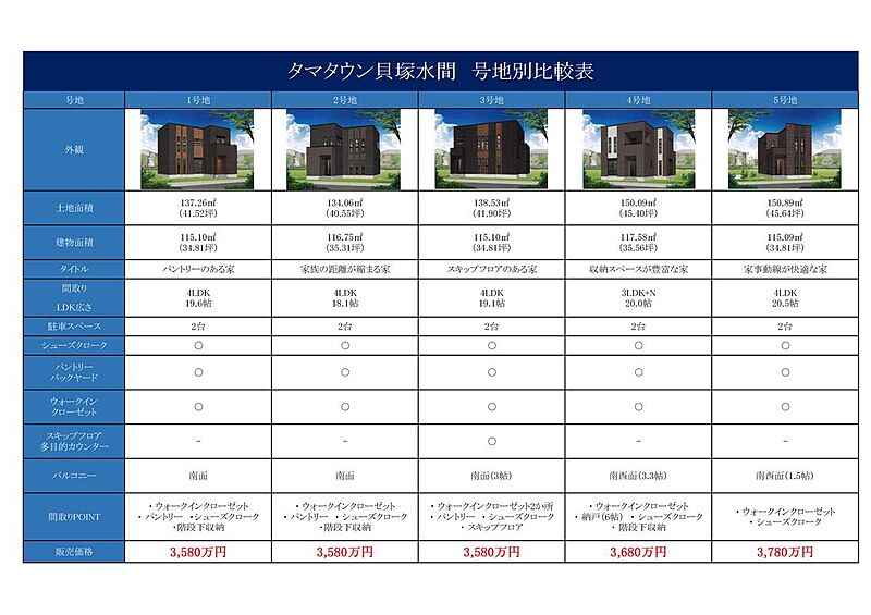 号地比較表 間取り 4LDK 価格 未定 建物面積 115.09m2~117.58m2 土地面積 134.06m2~150.89m2 -