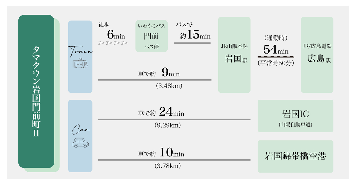- JR山陽本線「岩国」駅 車で約9分(約3,300m)
