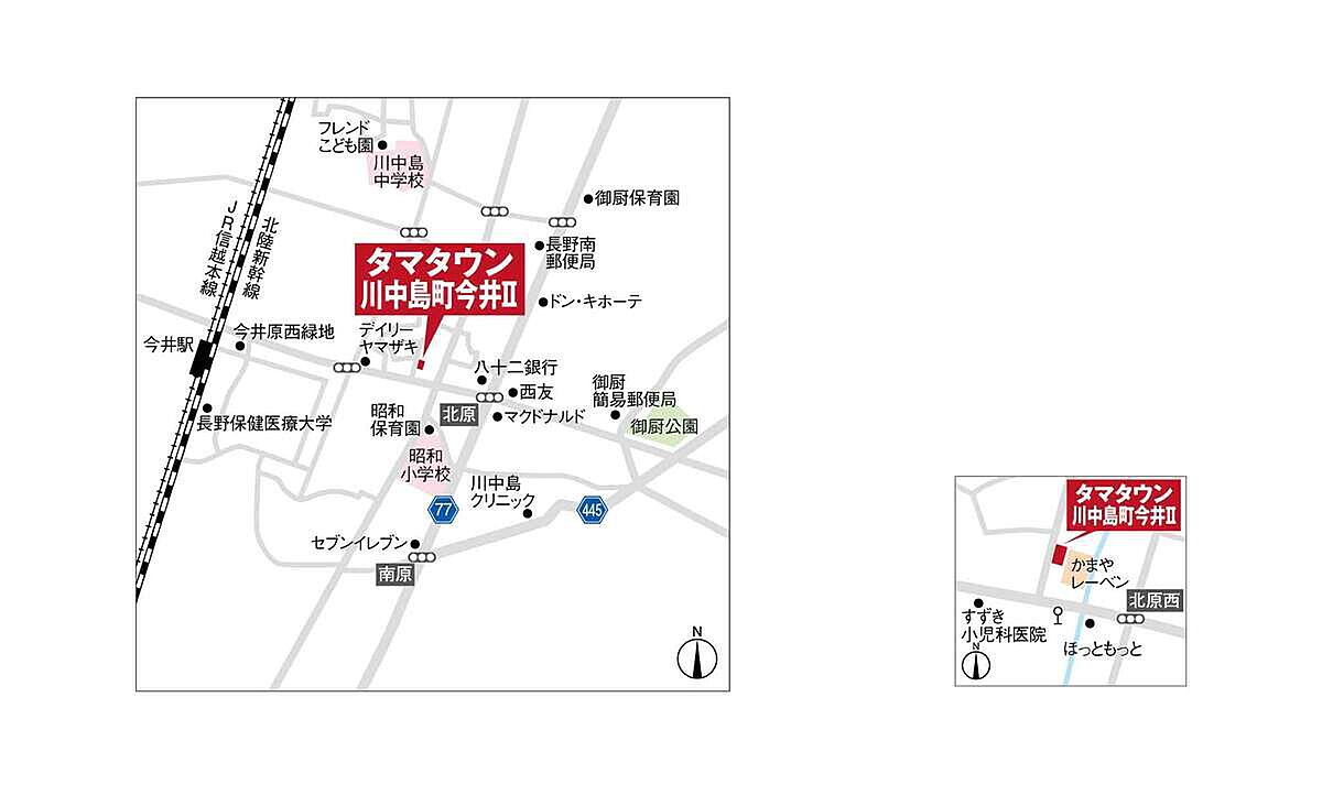JR信越本線「今井」駅 徒歩13分 JR信越本線「川中島」駅 徒歩38分 JR信越本線「篠ノ井」駅 徒歩35分 |