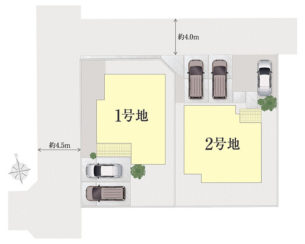 | 駐車場 | 2台 ~ 3台 | 道路の幅員 | 西側4.5m公道、北側4m(私道負担あり) |