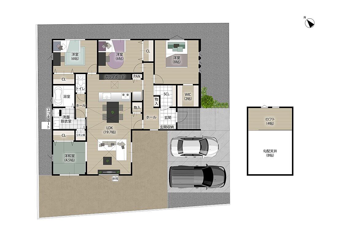 - ※完成予想図やCG合成画像は、門塀・植栽・庭・外観等、実際とは多少異なる場合があります。