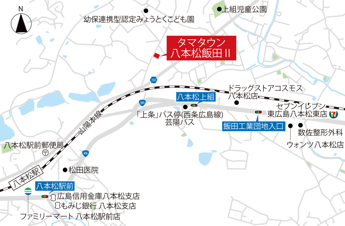 JR山陽本線「八本松」駅 徒歩10分 JR山陽本線「寺家」駅 車で約9分(約3,300m) |