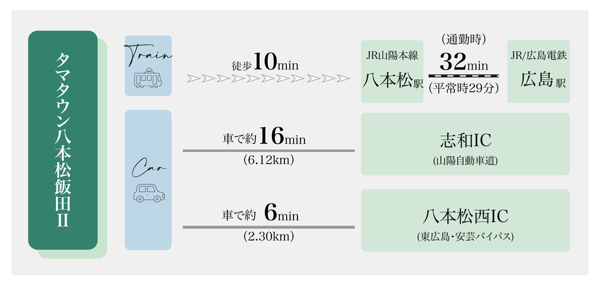 東広島・安芸バイパス「八本松西」ICまで約2,300m(車約6分)、広島市内への交通アクセスが良くなり人気があるエリアです。