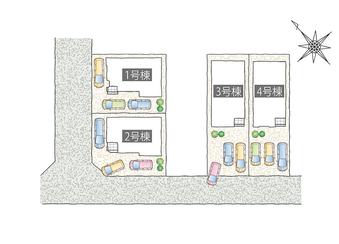 | 駐車場 | 2台 ~ 3台(車種による) | 道路の幅員 | 東側6m、南側6m |