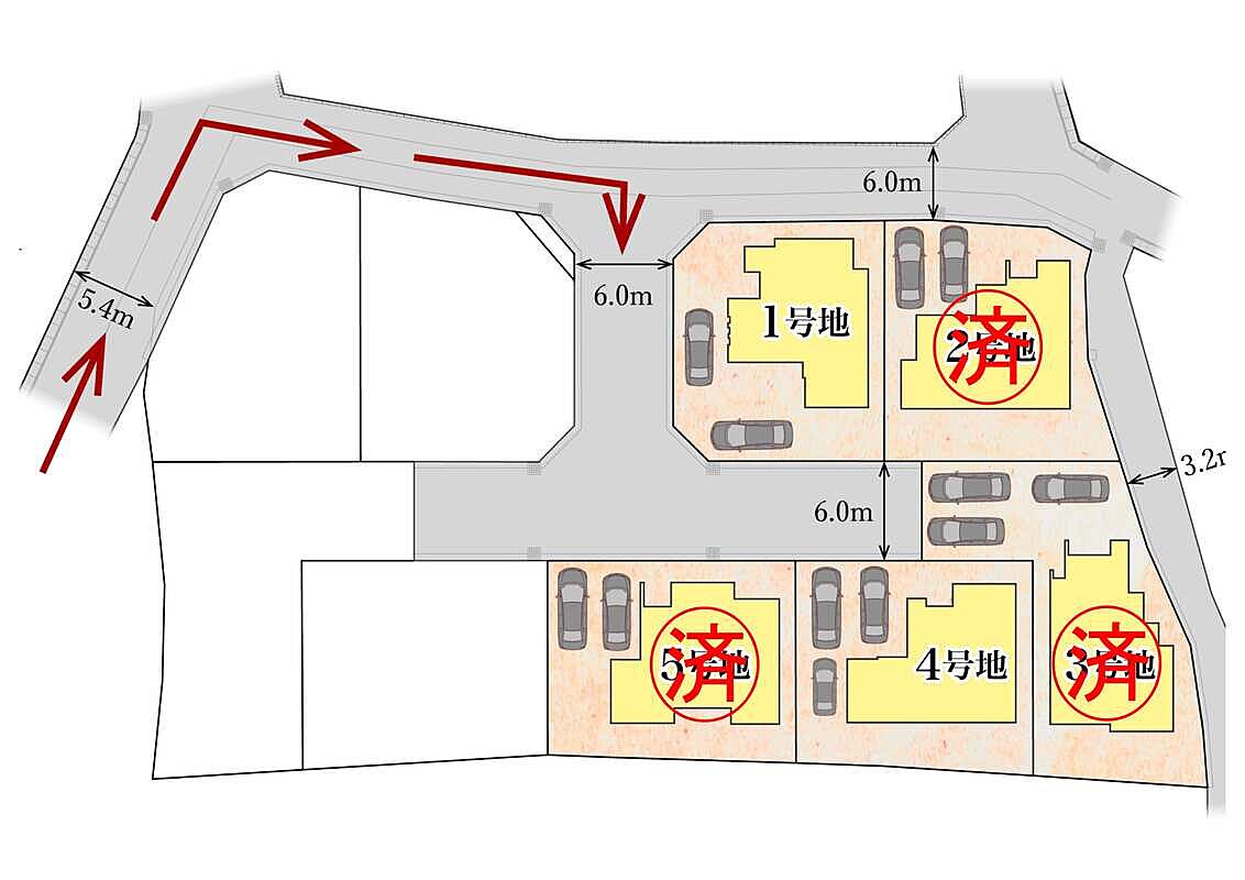 | 駐車場 | 2台 ~ 3台(1号地(2台)・4号地(3台)) | 道路の幅員 | 道路幅:6m、アスファルト舗装、私道負担/無し |