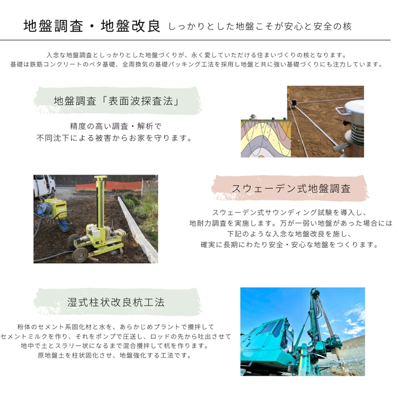 入念な地盤調査としっかりとした地盤づくりが、末永く愛していただける住まいづくりの核となります。