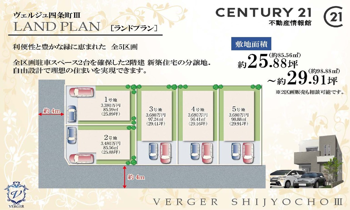 利便性と豊かな緑に恵まれた全5区画の自由設計分譲地が誕生!耐震性・省エネルギー性に優れ、税制・金利優遇が受けられる【長期優良住宅】対応。