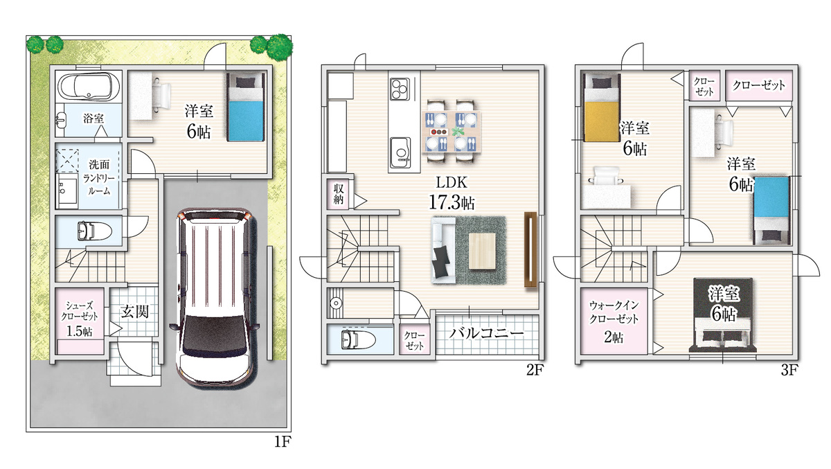 - ※完成予想図やCG合成画像は、門塀・植栽・庭・外観等、実際とは多少異なる場合があります。