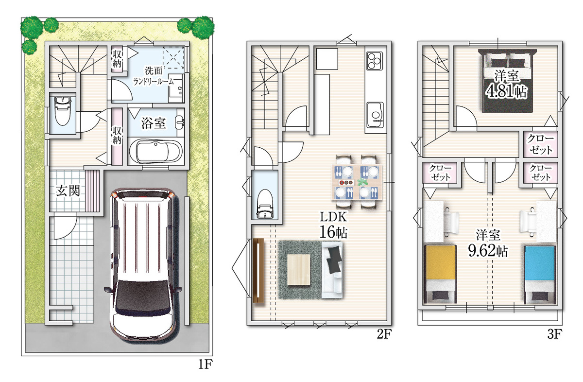 人気エリアの新築3階建て!16帖LDK&可変式洋室で家族のライフスタイルに対応!ビルトインガレージ付きで雨の日も安心です!