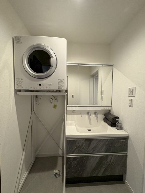 大きな窓で明るい浴室。浴室乾燥機で雨や湿...
