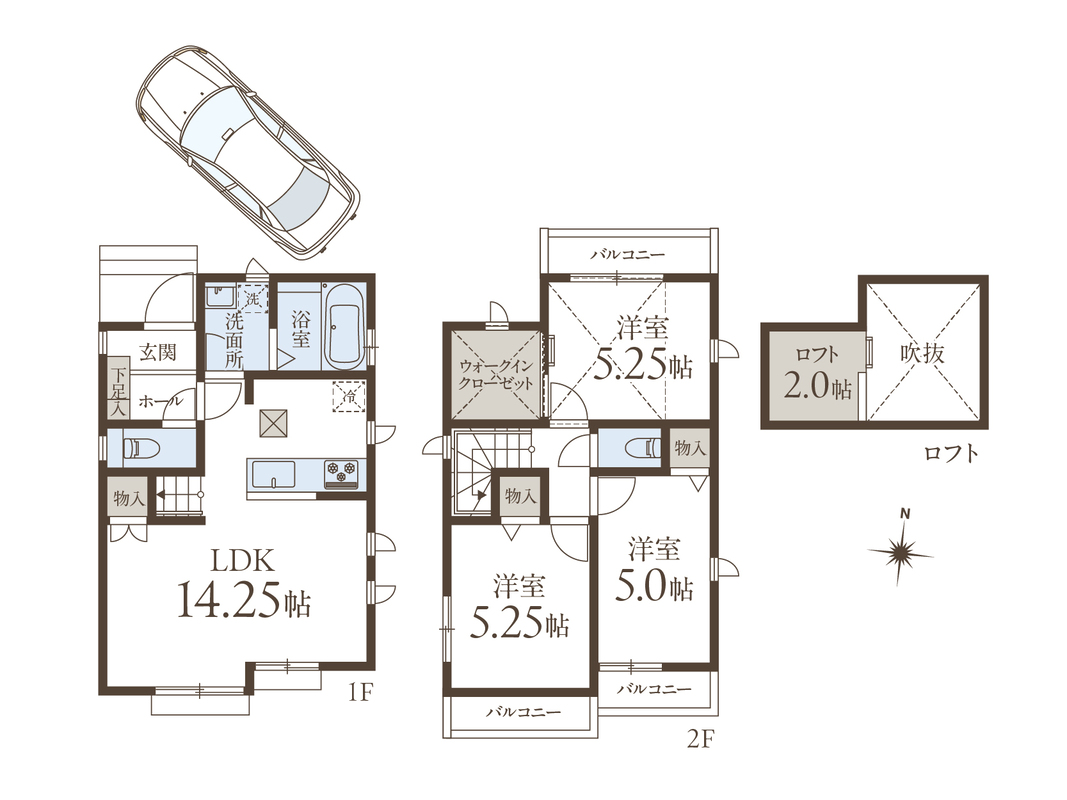 | 建物面積 | 72.04m2・74.42m2(21.79坪・22.51坪) | 土地面積 | 90.13m2・93.89m2(27.26坪・28.40坪) |