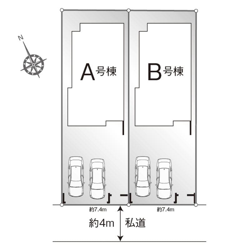| 駐車場 | 2台(車種による) | 道路の幅員 | 南側 約4.0m私道 |