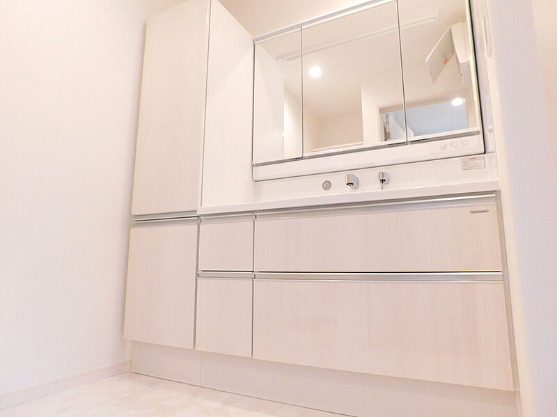 収納豊富な三面鏡付き洗面化粧台。物が多く...