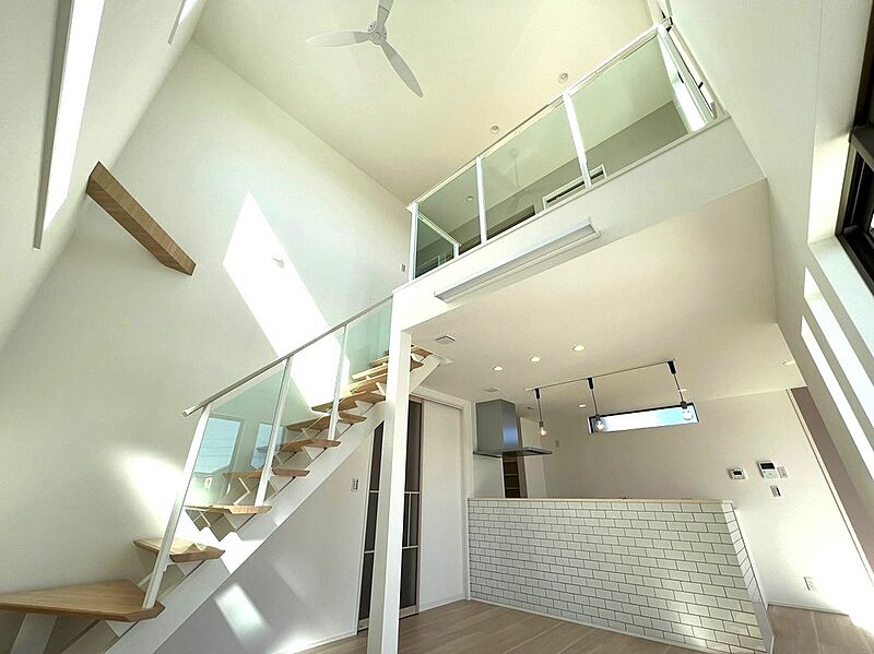 スケルトン階段があり、吹き抜けのある開放感あるリビングです。階段上がってすぐのスペースはベランダにも出れる明るい空間です。NOCKもついており自由な時間を過ごせます。
