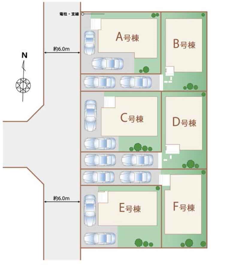 | 駐車場 | 2台 | 道路の幅員 | E号棟:西6m /A号棟:西6m /F号棟:西6m /C号棟:西6m /D号棟:西6m /B号棟:西6m |