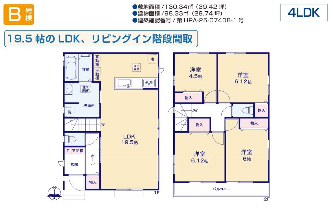 B号棟 間取り 4LDK 価格 3390万円 建物面積 98.33m2 土地面積 130.34m2 -