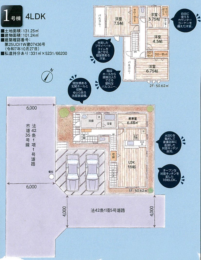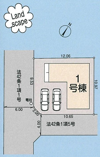 | 駐車場 | 2台 | 道路の幅員 | 1号棟:南西6m 南東4m |