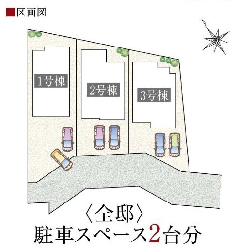 | 駐車場 | 2台 | 道路の幅員 | 2号棟:南西5m /3号棟:南西5m /1号棟:南西5m |
