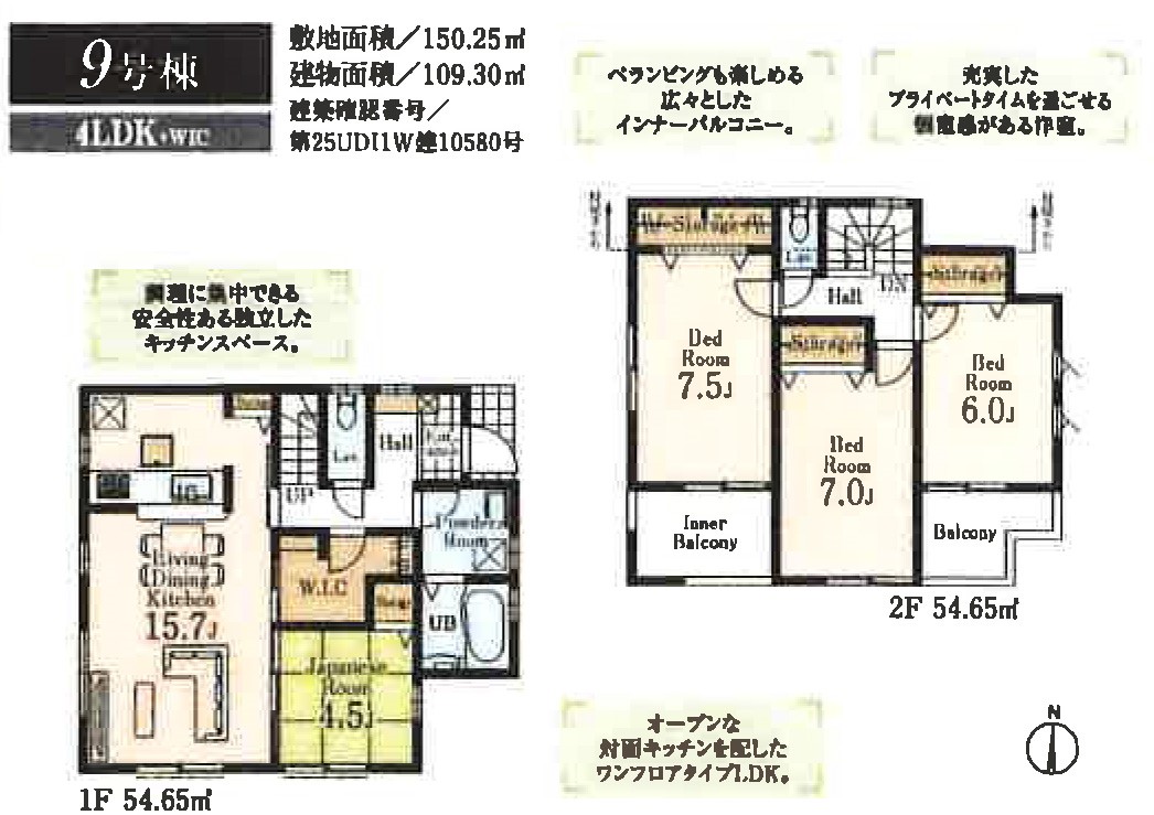 9号棟 間取り 4LDK 価格 3480万円 建物面積 109.3m2 土地面積 150.25m2