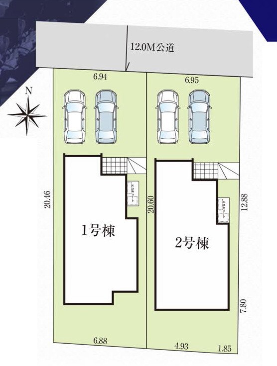 | 駐車場 | 2台 | 道路の幅員 | 2号棟:北12m /1号棟:北12m |