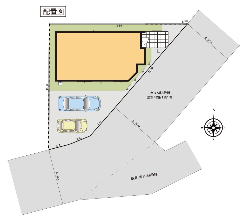 | 駐車場 | 2台 | 道路の幅員 | :南東6m |