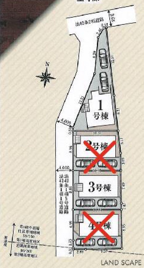 | 駐車場 | 2台 | 道路の幅員 | 1号棟:西4m /3号棟:西4m |