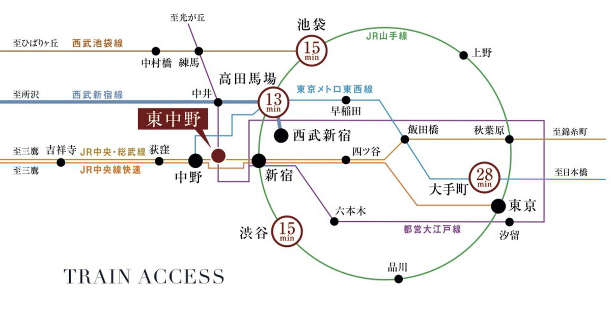 JR中央線「東中野」駅 徒歩7分 東京メトロ丸ノ内線「中野坂上」駅 徒歩13分 都営大江戸線「東中野」駅 徒歩11分 |