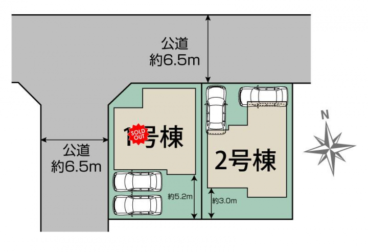 | 駐車場 | 2台 | 道路の幅員 | 北6.5m公道、西6.5m公道 |