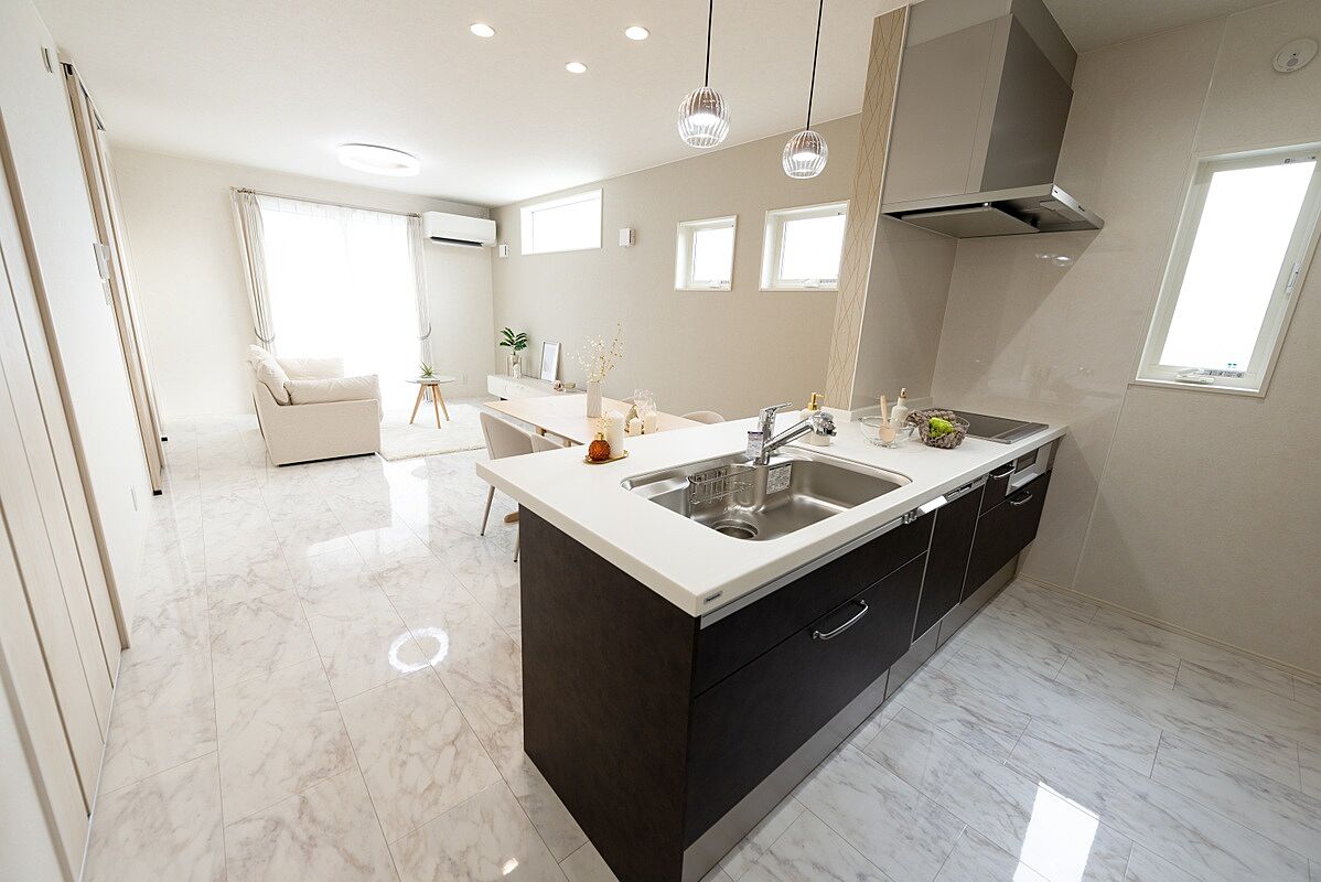 魅力1 ホワイトのフロア×ダークカラーのキッチンのコントラストが美しく、上質な住空間に。