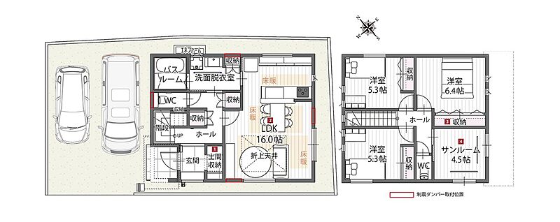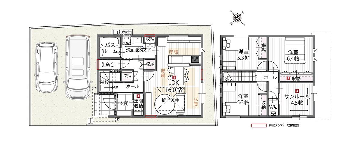 キッチン、ダイニング、リビングに床暖房を備え、都市ガス(エネト)×ソーラーパネル (スマイルーフ)を備えた4LDK。南側にLDKやサンルームを配置し、豊かな陽光に触れる心地よい暮らしを。