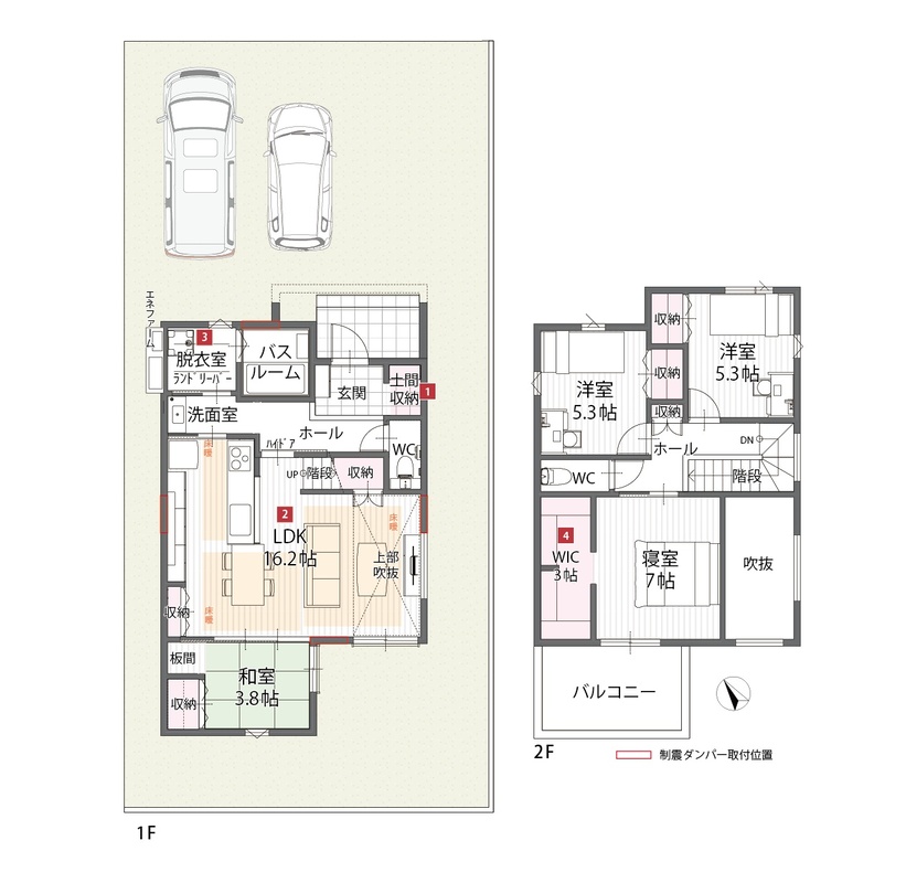 和風ナチュラルな雰囲気がほっこりと落ち着いたデザインで、吹抜からの自然光に満たされるLDKでご家族揃って寛ぎの時間を。ランドリー機能をプラスした脱衣室、玄関からアプローチしやすい洗面室など、暮らしに寄り添う工夫が随所に。