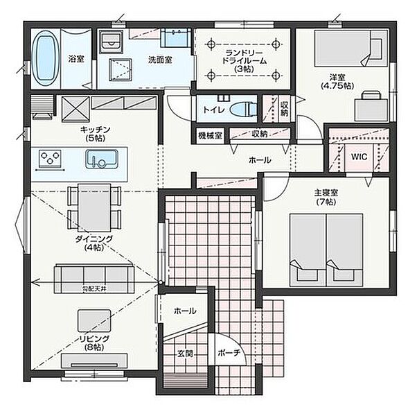吹抜けリビングと木目の勾配天井が開放感を演出し、配膳しやすいキッチンや十分な収納スペースなど、暮らしやすさに配慮した住まいです。