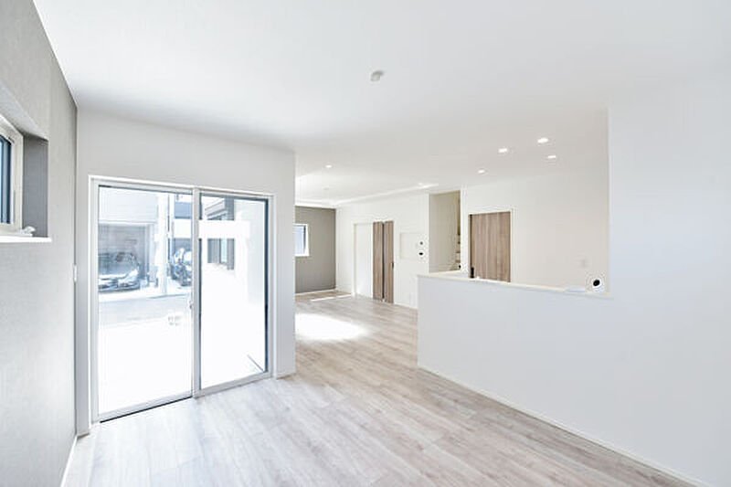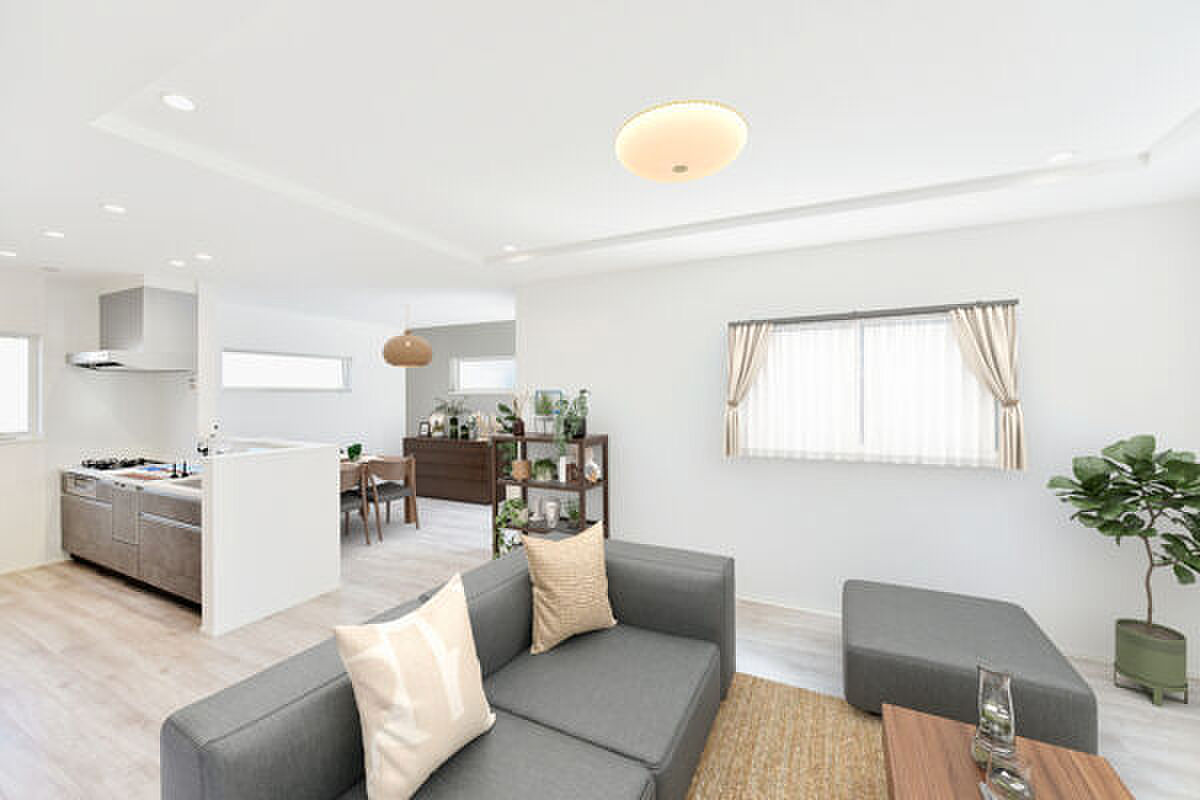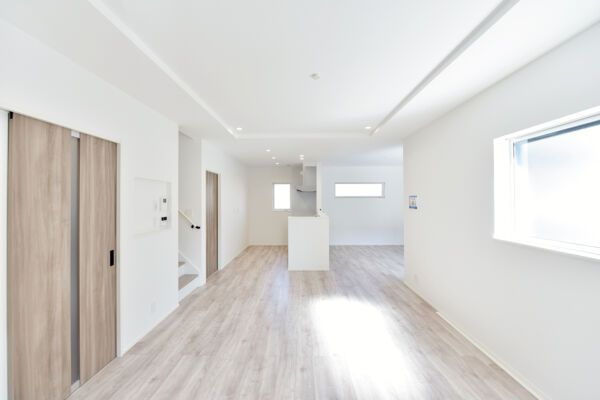 家族が集まるLDKは広々18畳超。木造2階建の新築分譲住宅です。