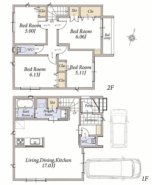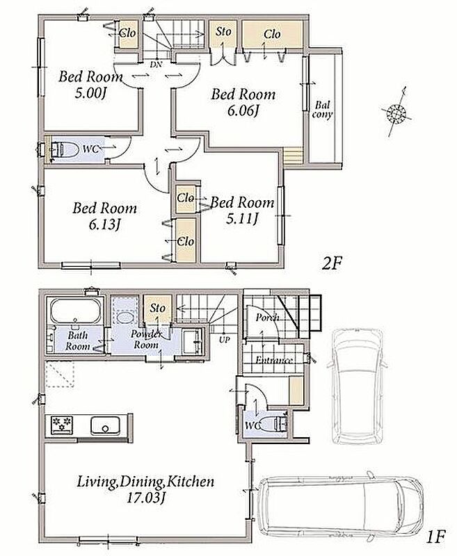 1階LDKはゆとりある17畳。カースペース付きの2階建て新築分譲住宅です。