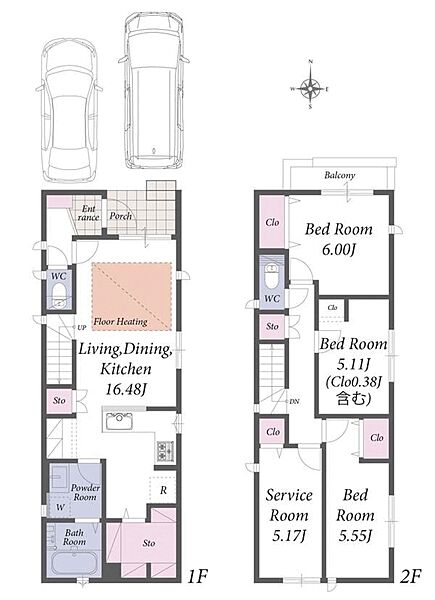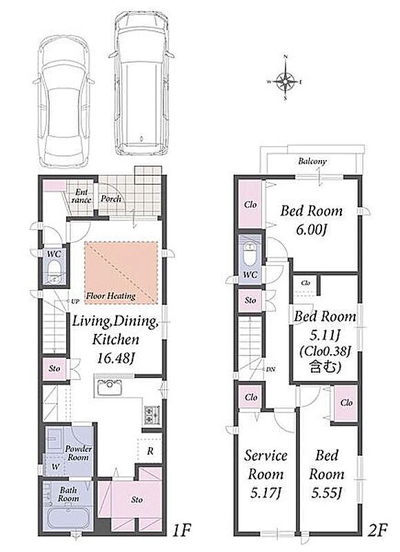 並列2台駐車可能な2階建ての新築分譲住宅。浴室はゆったり1坪サイズです。