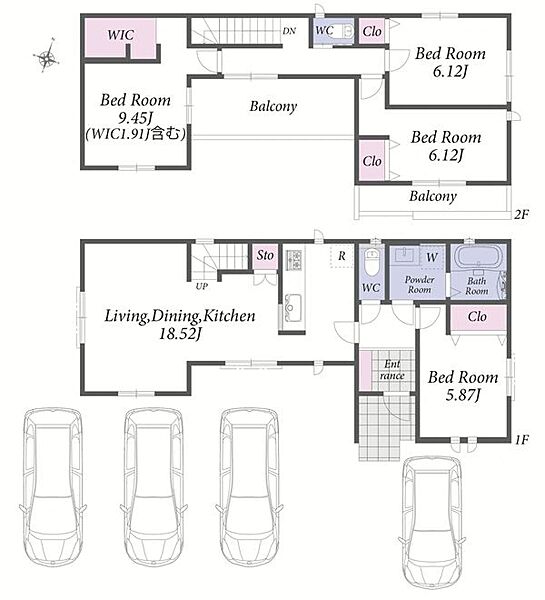 お車4台駐車可能。1階LDKは広々18畳。2階建ての新築分譲住宅です。