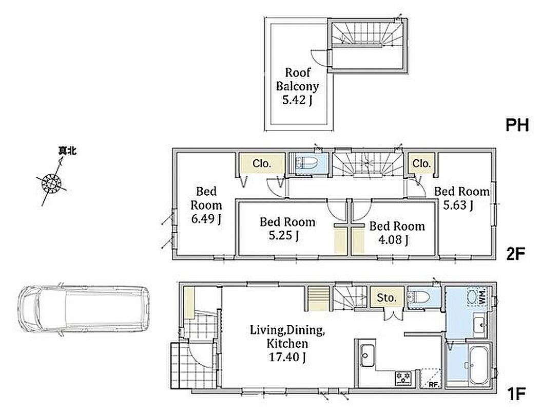 1階LDKはゆとりある17畳。ルーフバルコニー付きの2階建て新築分譲住宅。