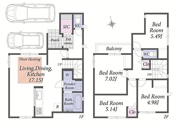 並列駐車2台可能。間口は広々12mで開放感のある2階建て新築戸建です。