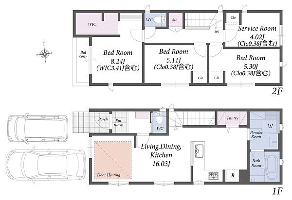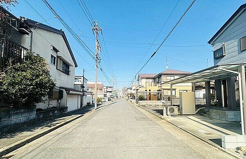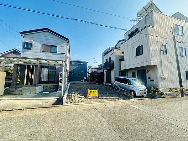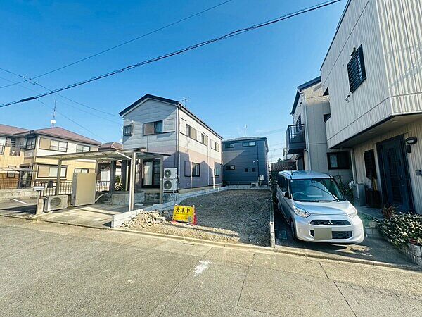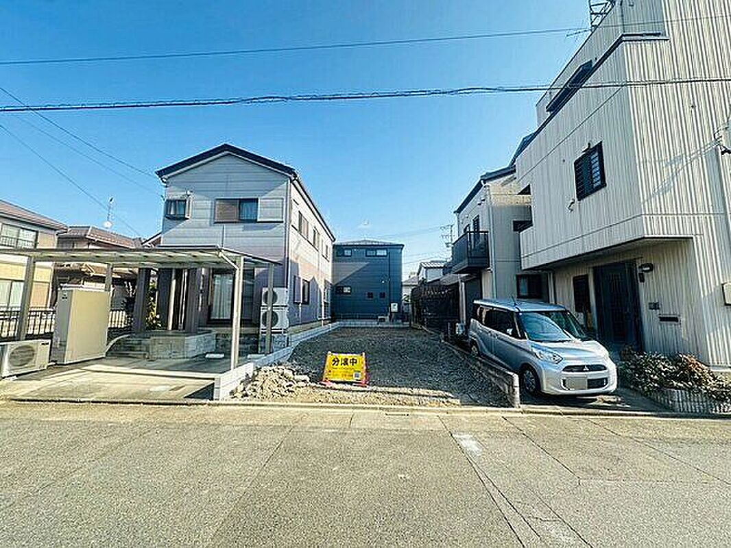 前面道路は広々8.6m公道。並列2台駐車可能な2階建ての新築住宅です。